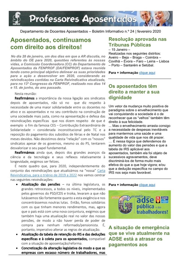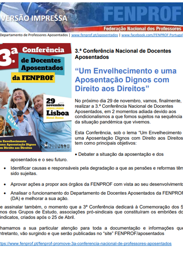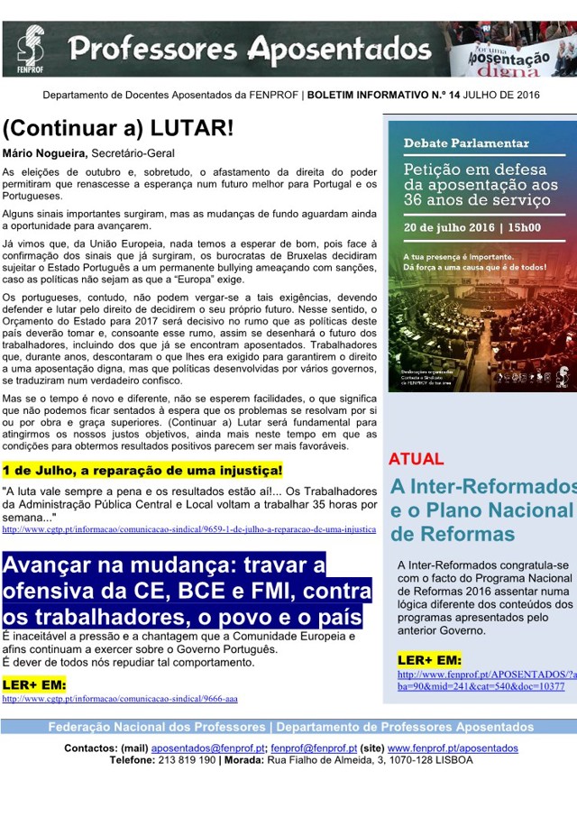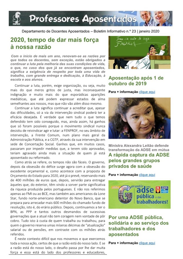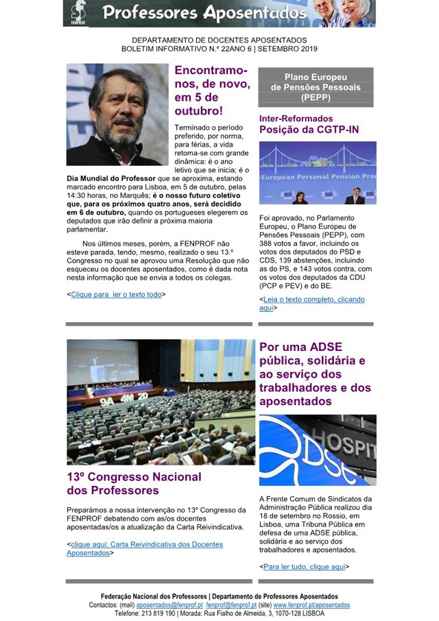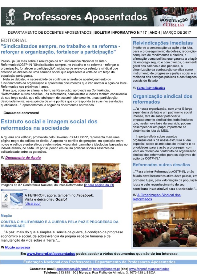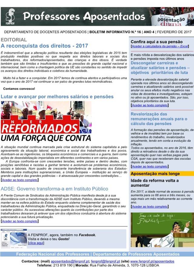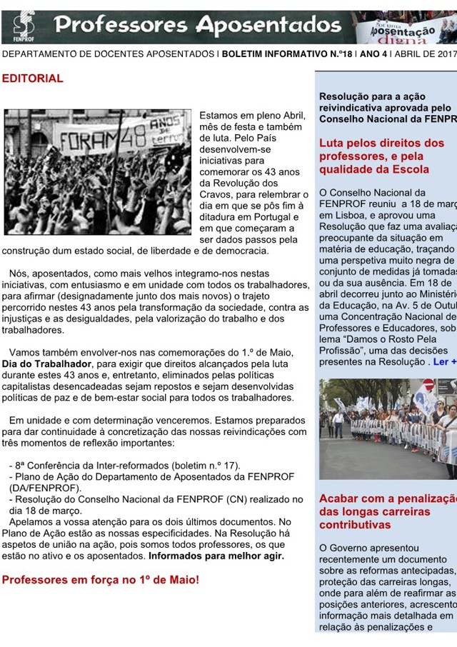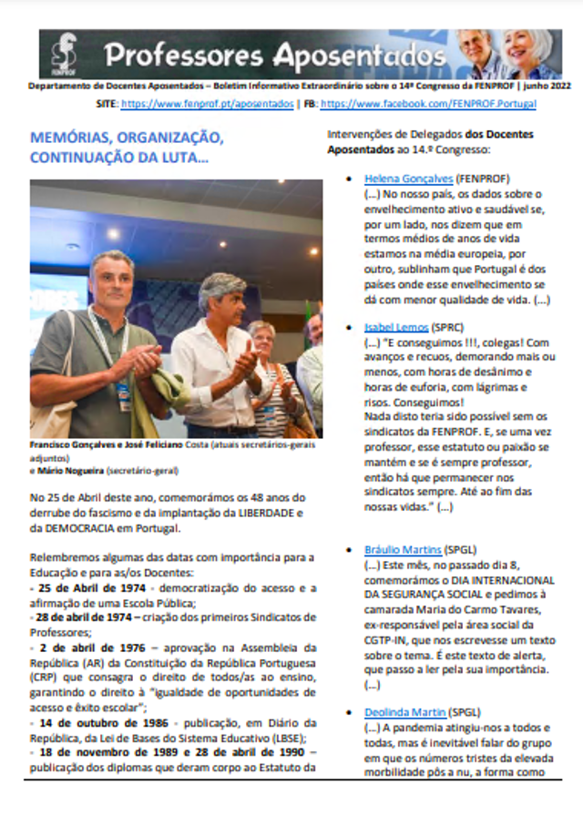 Trata-se de um suplemento organizado pelo Departamento de Professores Aposentados da FENPROF, com o contributo histórico de docentes especialmente entrevistados porque constituem a memória da FENPROF, bem como da sua intervenção desde a fundação há 41 anos, e, por esse motivo, contribuem, para o melhor conhecimento das bases na Educação e do Portugal de Abril. Por esse motivo, foi opção começar cada um destes suplementos com a transcrição do articulado específico de cada um dos temas na Constituição da República Portuguesa. [consultar]