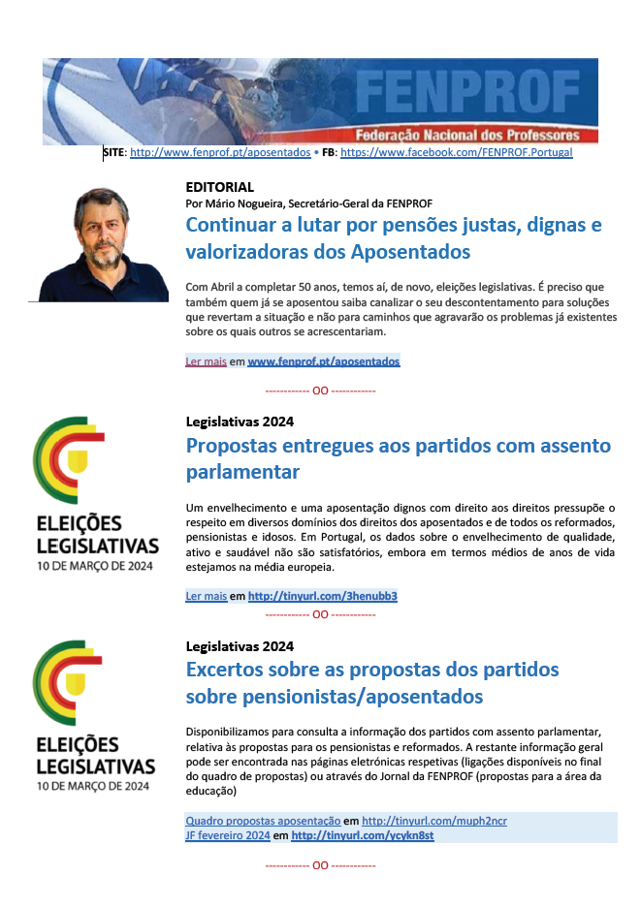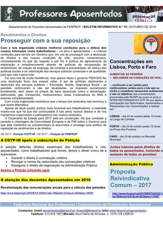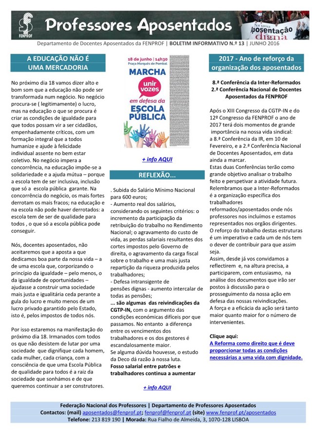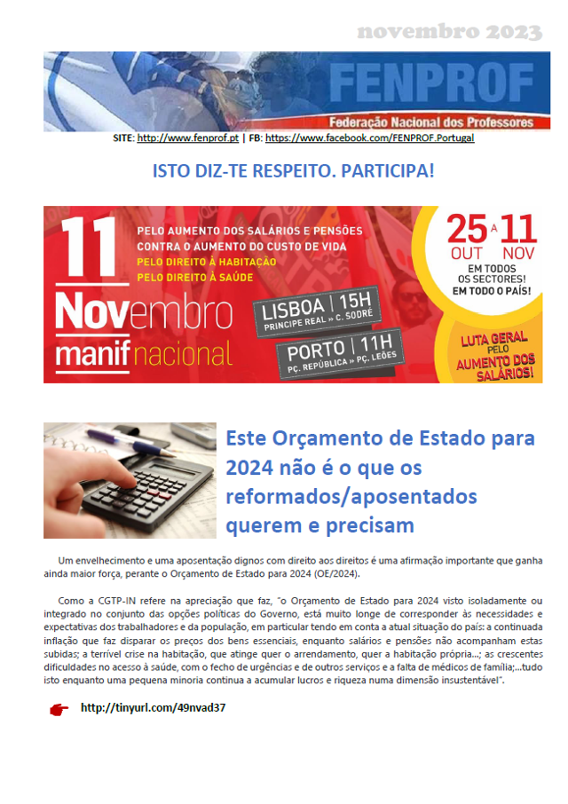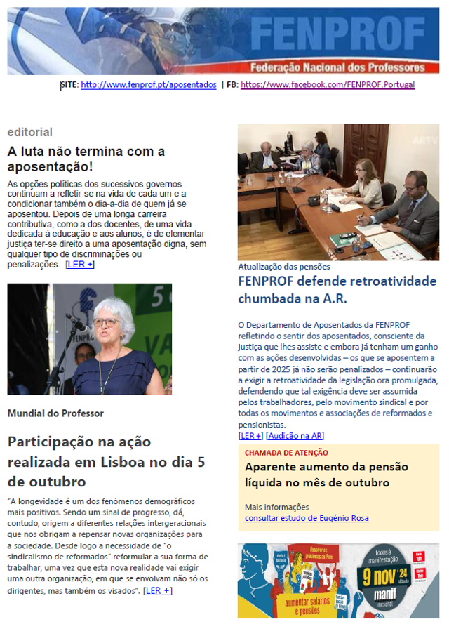 Quando reclama “Respeito!” pelos professores e o seu trabalho, a FENPROF não distingue os que ainda estão no ativo dos que já se aposentaram ou reformaram, portanto, não discrimina os que deram uma vida à escola e aos alunos em relação aos que o fazem agora. O mesmo não acontece da parte de governantes que parecem ávidos em se desembaraçar daqueles que formaram cidadãos e produziram riqueza, mas já entregaram a outros o rico património que criaram.