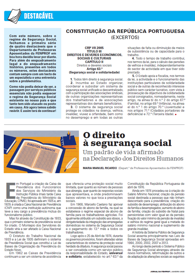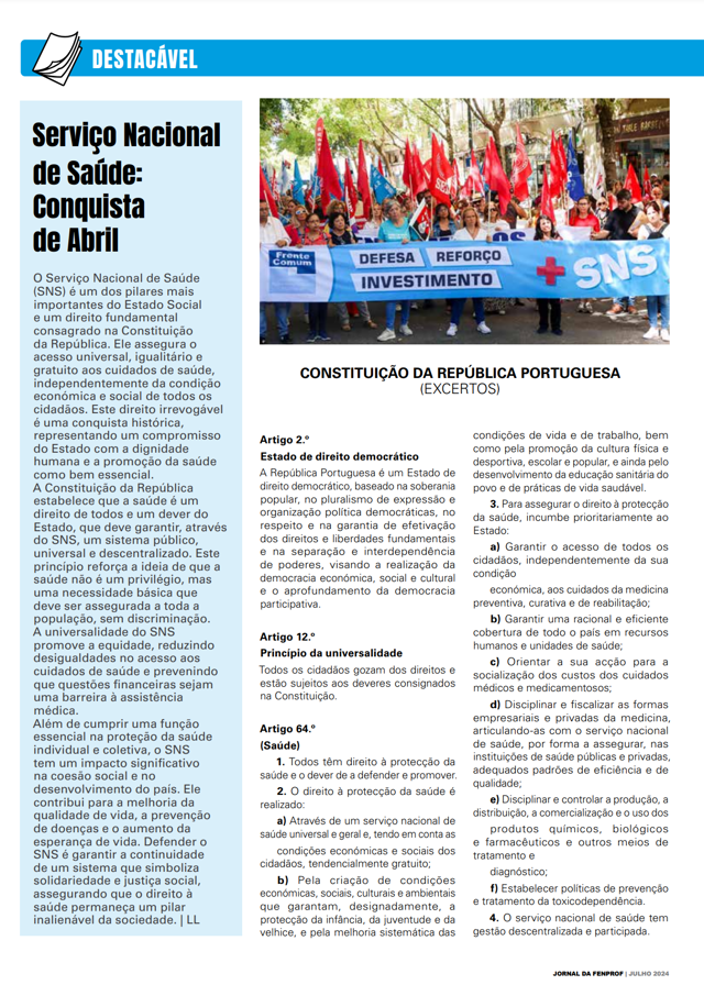 O Jornal da FENPROF inicia, com este suplemento, colecionável, um conjunto de quatro publicações, até ao final de 2024 que tratarão os seguintes temas: a) Educação/ Escola Pública; b) Luta pela profissão docente; c) O direito à saúde pública; d) Segurança social pública e universal.
