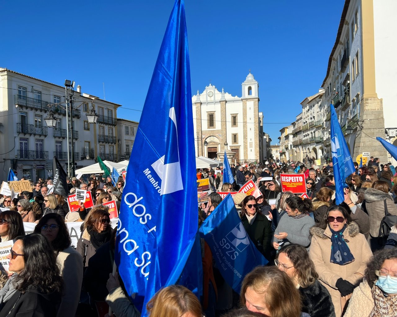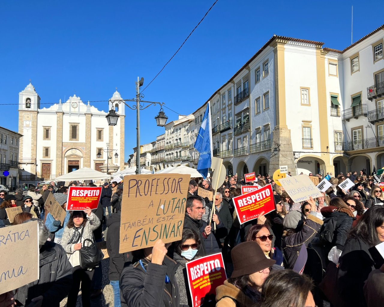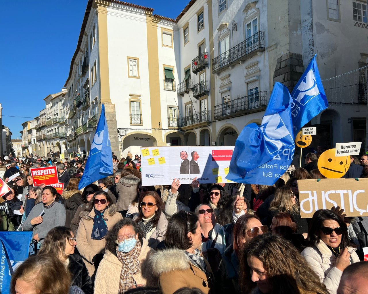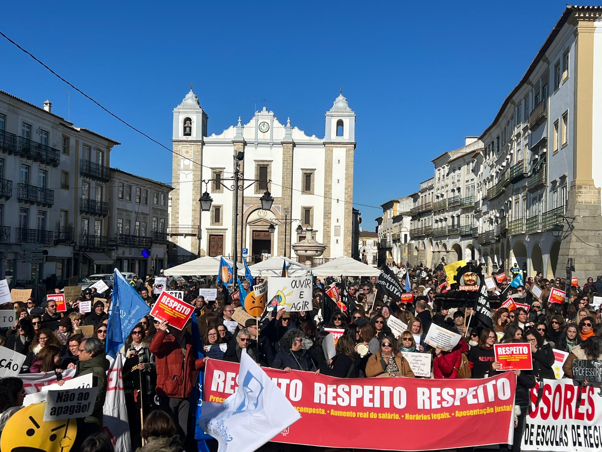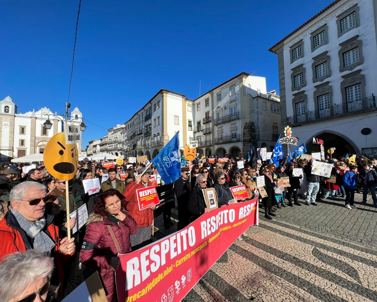 Os professores em greve no distrito de Évora concentraram-se logo pela manhã na Escola Secundária Gabriel Pereira e na Escola Básica Manuel Ferreira Patrício e seguiram, depois, em desfile até ao coração da capital do distrito para exigirem respeito e dizerem ao ME que a luta não vai parar.