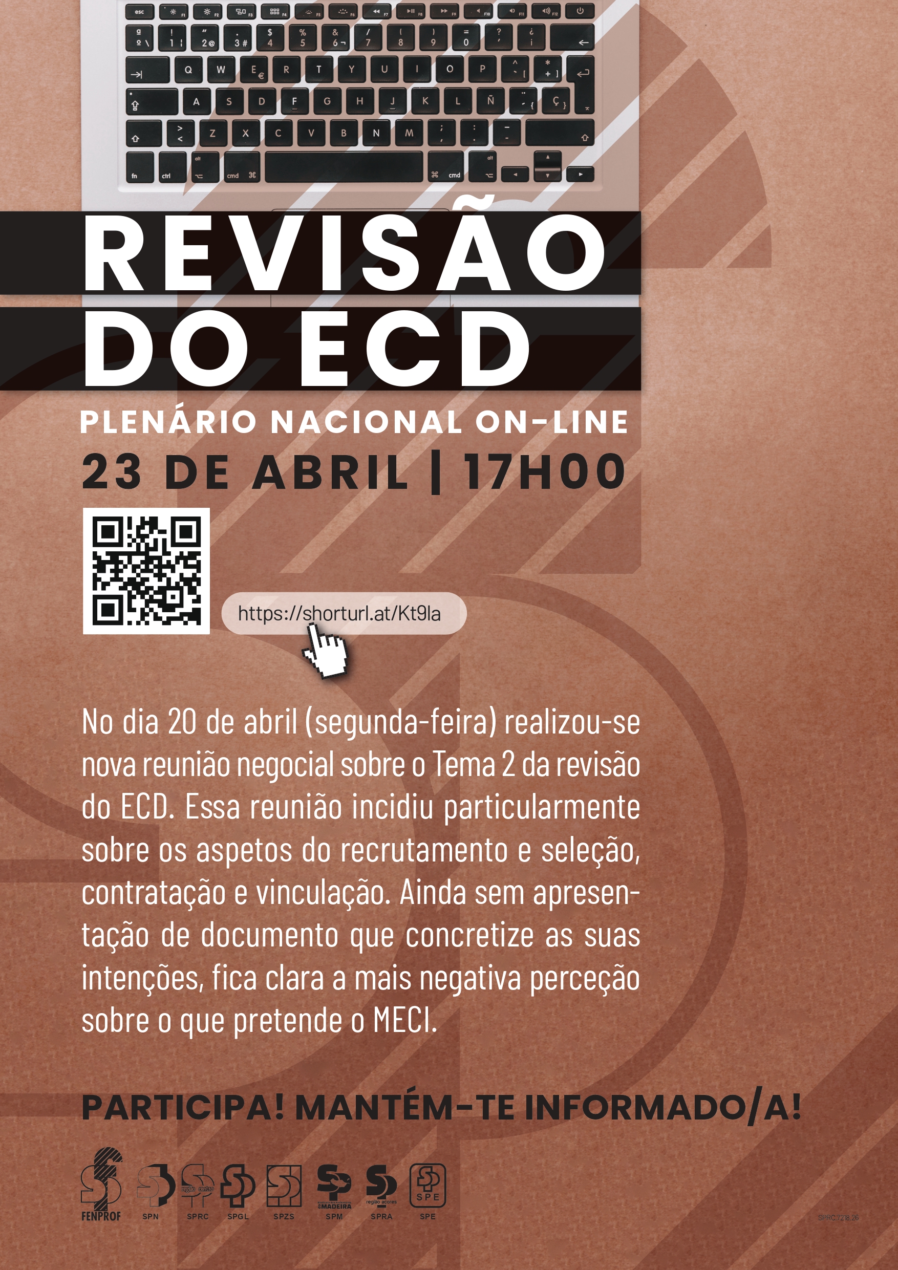 Após a reunião de 20 de abril com o Ministério da Educação, Ciência e Inovação (MECI), no âmbito do processo de revisão do Estatuto da Carreira Docente, dedicada ao Tema 2 do protocolo negocial - “Habilitação para a docência, recrutamento e admissão” - e, em particular, ao modelo de recrutamento e colocação de docentes, a FENPROF vai realizar mais um plenário de esclarecimento aos professores e educadores na quinta-feira, 23 de abril, a partir das 17 horas.