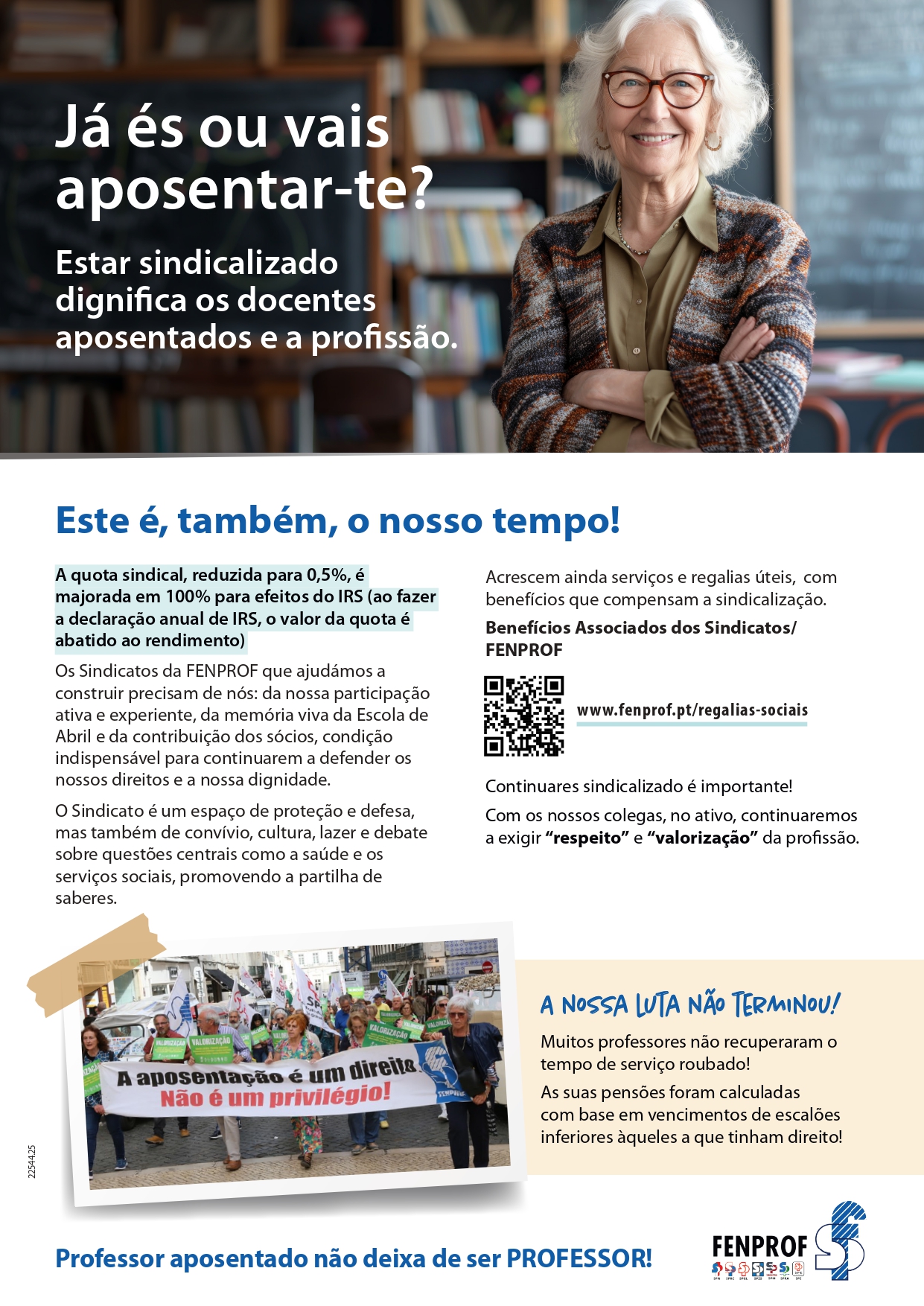 Para proporcionar aos aposentados, reformados e pensionistas a vida digna que merecem, após anos e anos de trabalho, a FENPROF exige um aumento significativo e generalizado de todas as pensões, a sua atualização anual que permita, de facto, recuperar e melhorar o poder de compra de todos os pensionistas e dar uma resposta consistente a todas as suas necessidades, bem como a revisão da legislação.