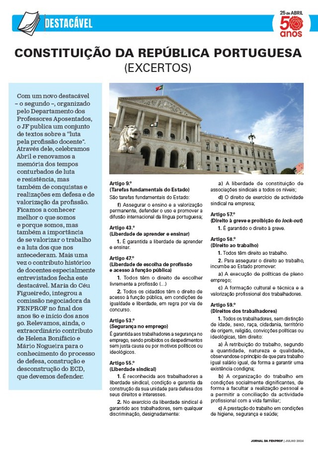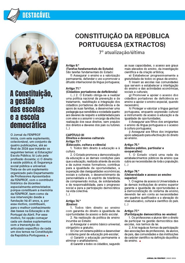 Trata-se de um suplemento organizado pelo Departamento de Professores Aposentados da FENPROF, com o contributo histórico de docentes especialmente entrevistados porque constituem a memória da FENPROF, bem como da sua intervenção desde a fundação há 41 anos, e, por esse motivo, contribuem, para o melhor conhecimento das bases na Educação e do Portugal de Abril. Por esse motivo, foi opção começar cada um destes suplementos com a transcrição do articulado específico de cada um dos temas na Constituição da República Portuguesa. [consultar]