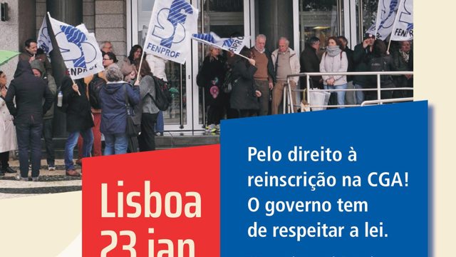 É um direito legal inequívoco, confirmado por todas as decisões proferidas pelos tribunais, a reinscrição de ex-subscritores na Caixa Geral de Aposentações (CGA). Saíram do regime por motivos que não lhes são imputáveis. FENPROF estará concentrada no dia 23 de janeiro, terça-feira, pelas 10:30 horas, junto à Residência Oficial do Primeiro- Ministro, tendo solicitado uma audiência com o chefe do atual governo para as 11:30 horas.