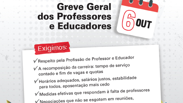 Para 6 de outubro, está marcada uma Greve Nacional dos Professores e dos Educadores, com os objetivos que constam do Pré-Aviso de Greve apresentado e convocada em convergência por ASPL, FENPROF, FNE, PRÓ-ORDEM, SEPLEU, SINAPE, SINDEP, SIPE e SPLIU.