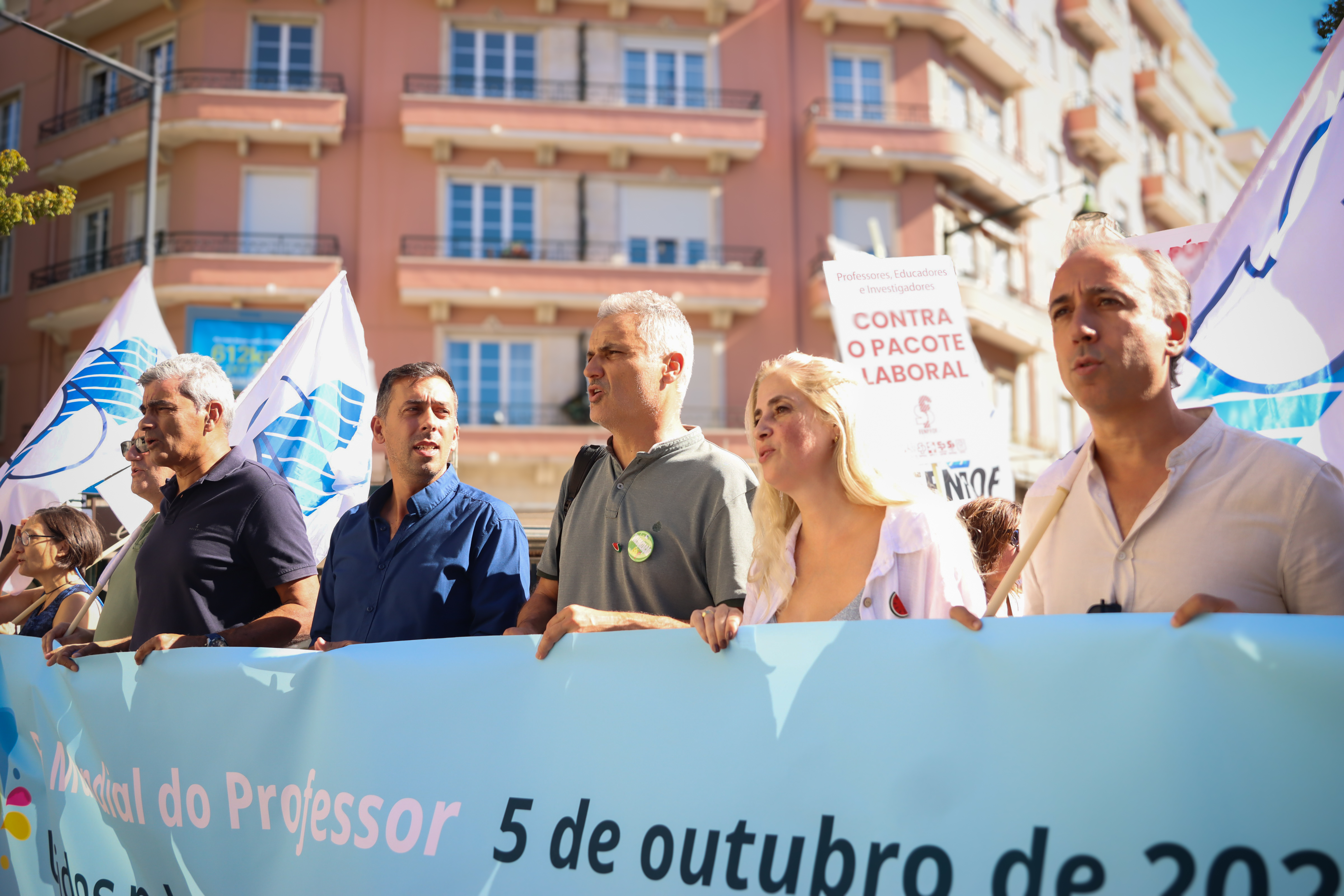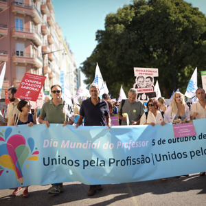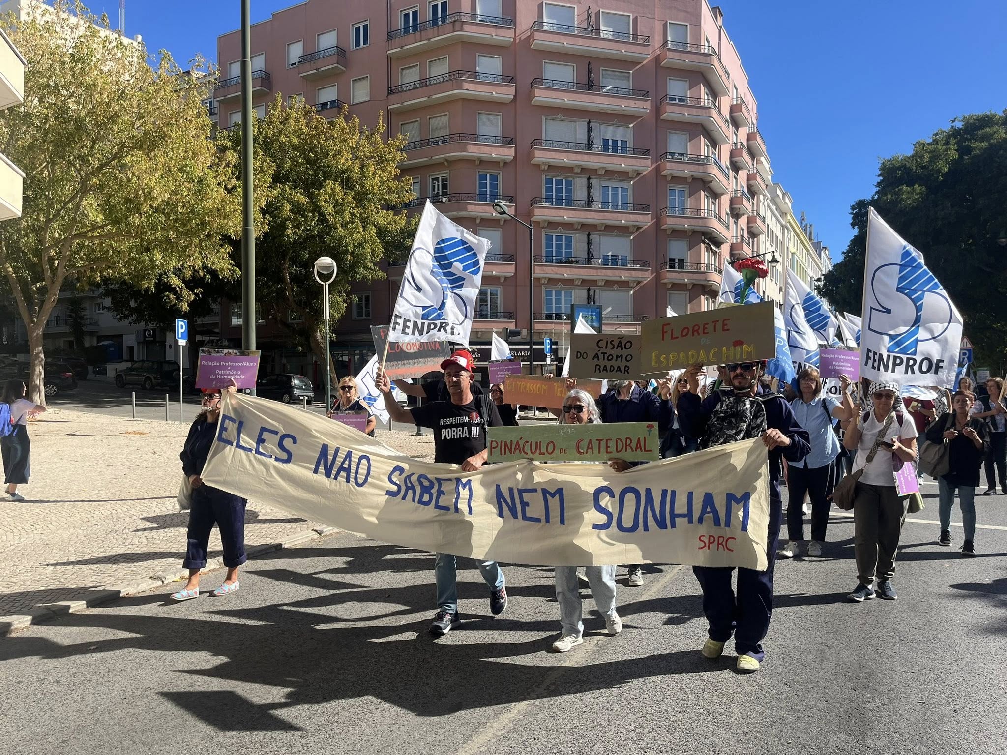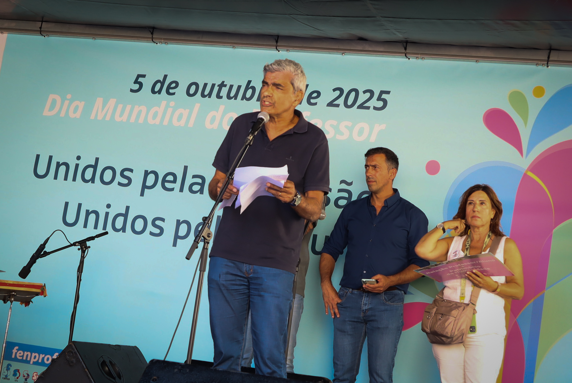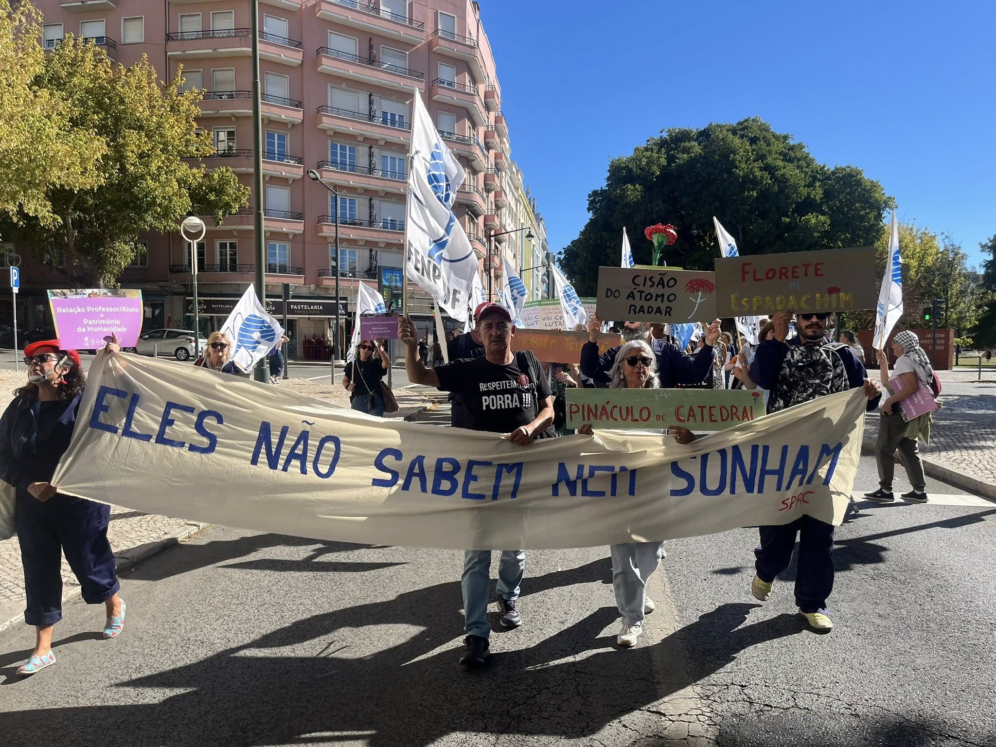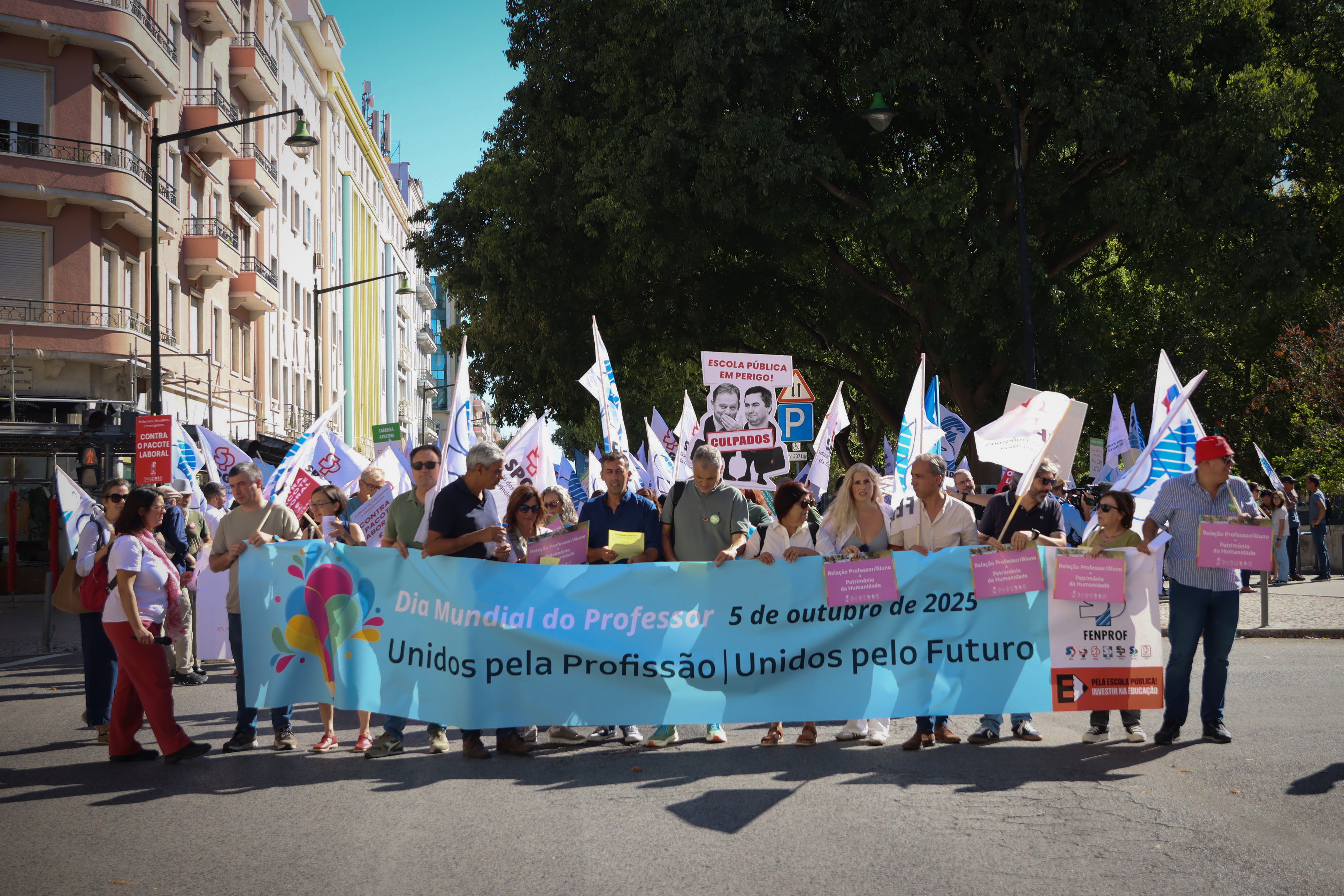 A FENPROF celebrou o 5 de outubro, Dia Mundial dos Professores, este sábado, dia 4 de outubro, com uma ação de luta em Lisboa, com concentração e desfile, desde o Jardim do Arco do Cego até ao edifício sede da Presidência do Conselho de Ministros, para lembrar ao governo os compromissos assumidos internacionalmente, reclamar de novo a valorização da profissão docente e reafirmar que a Educação não pode esperar!