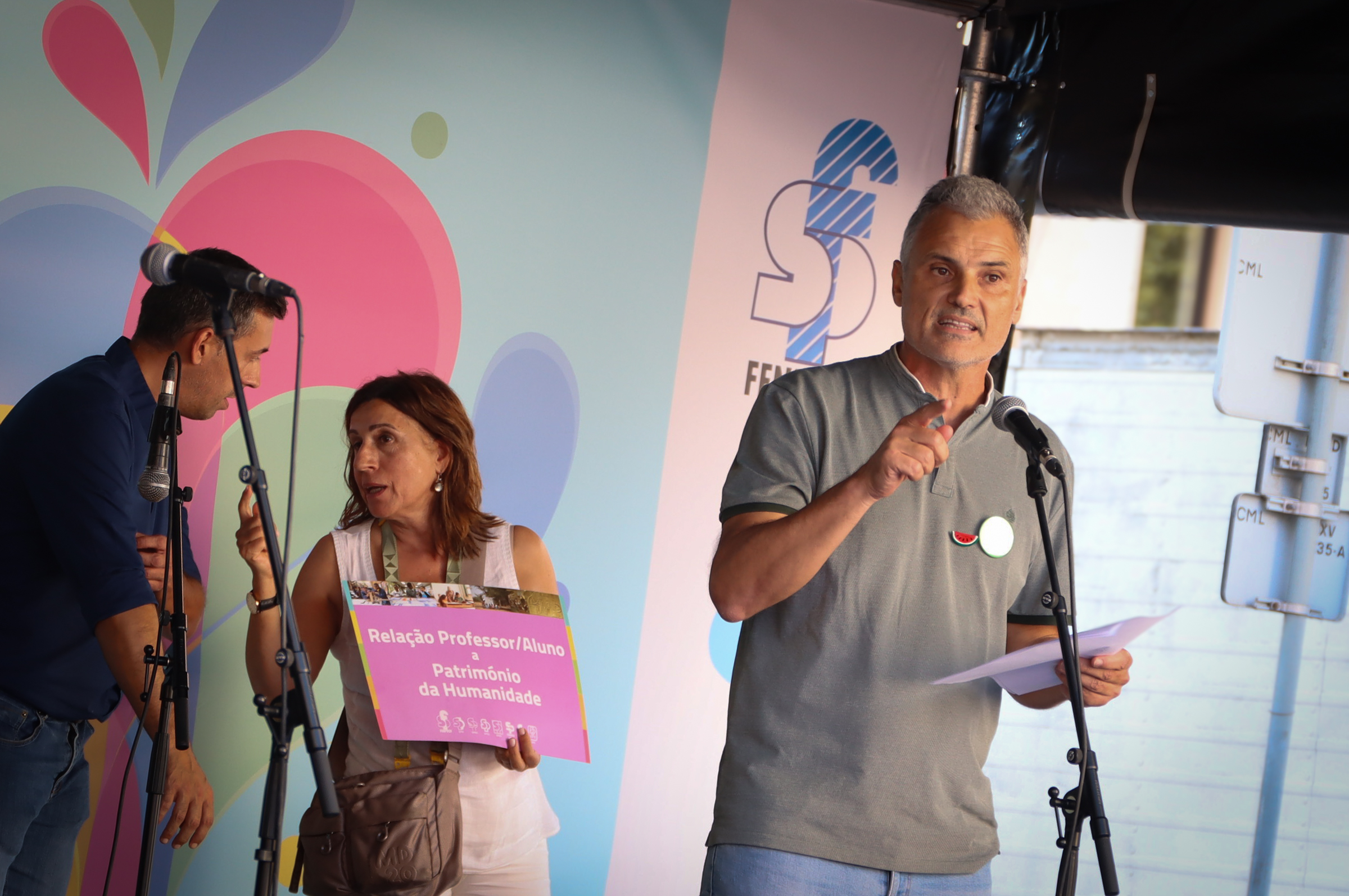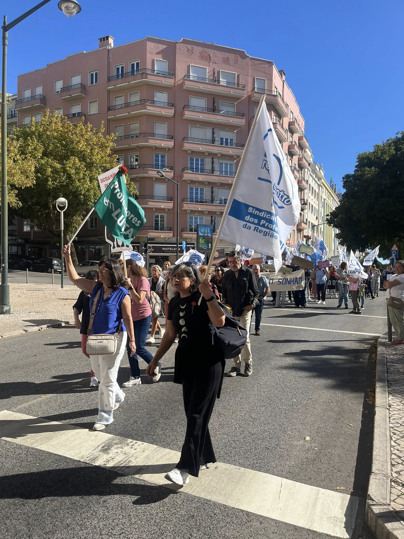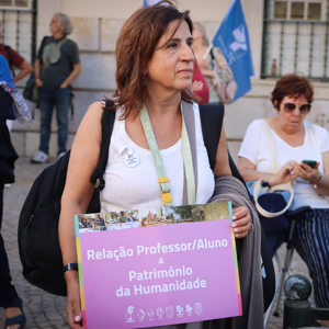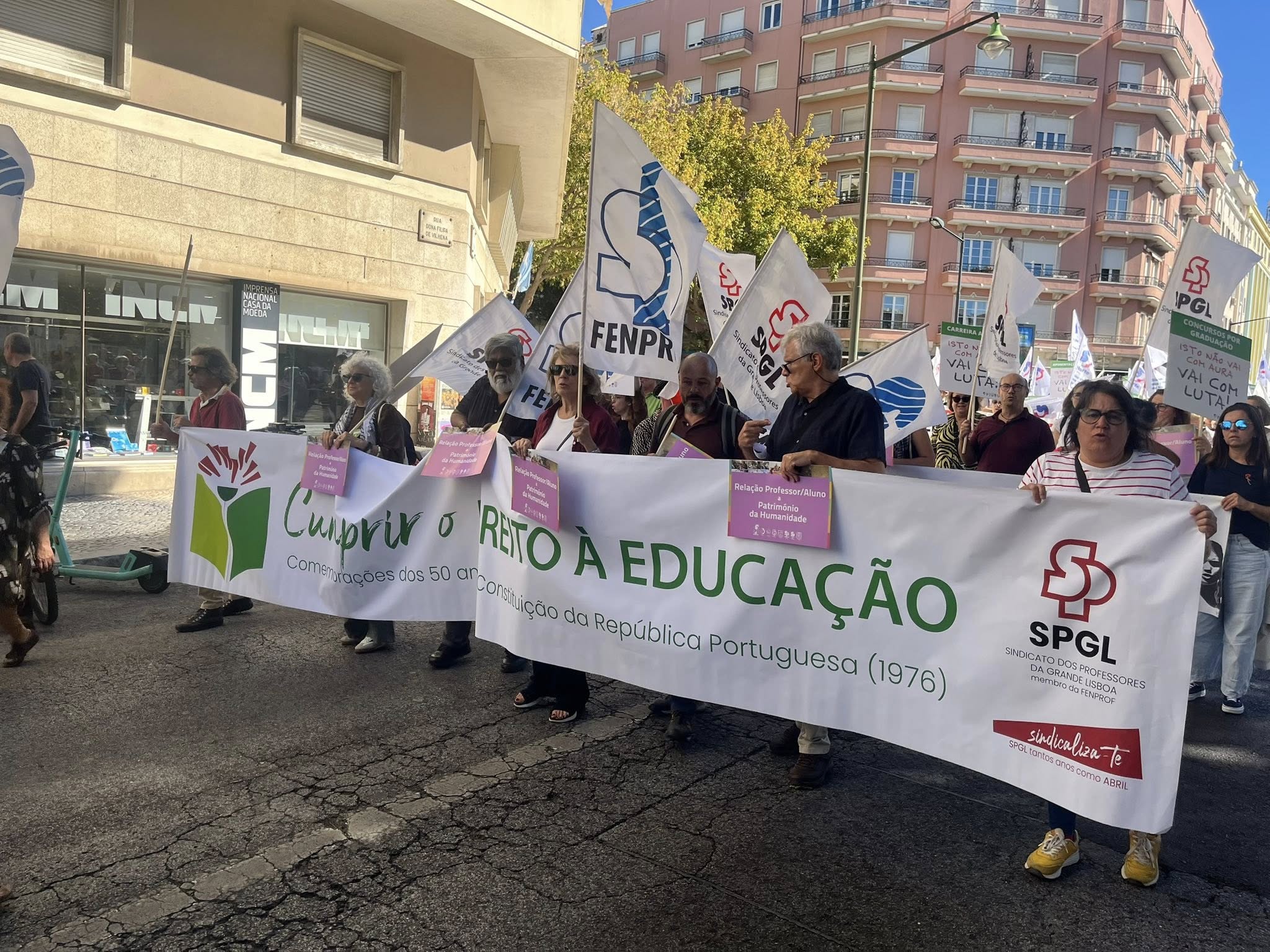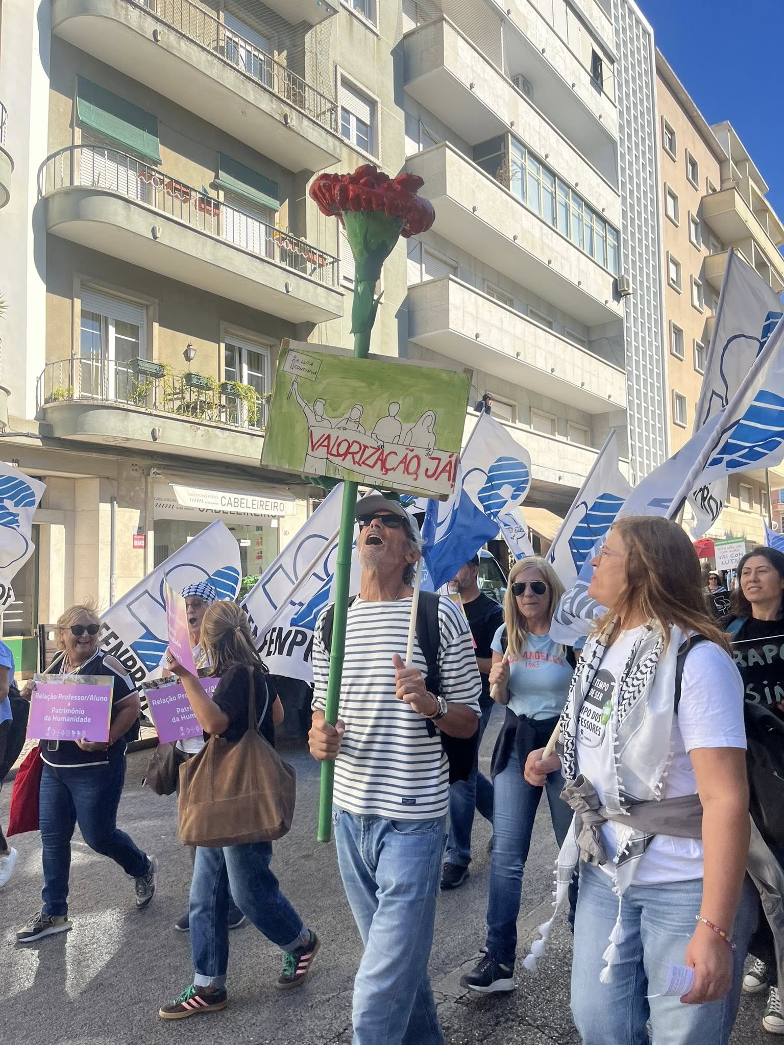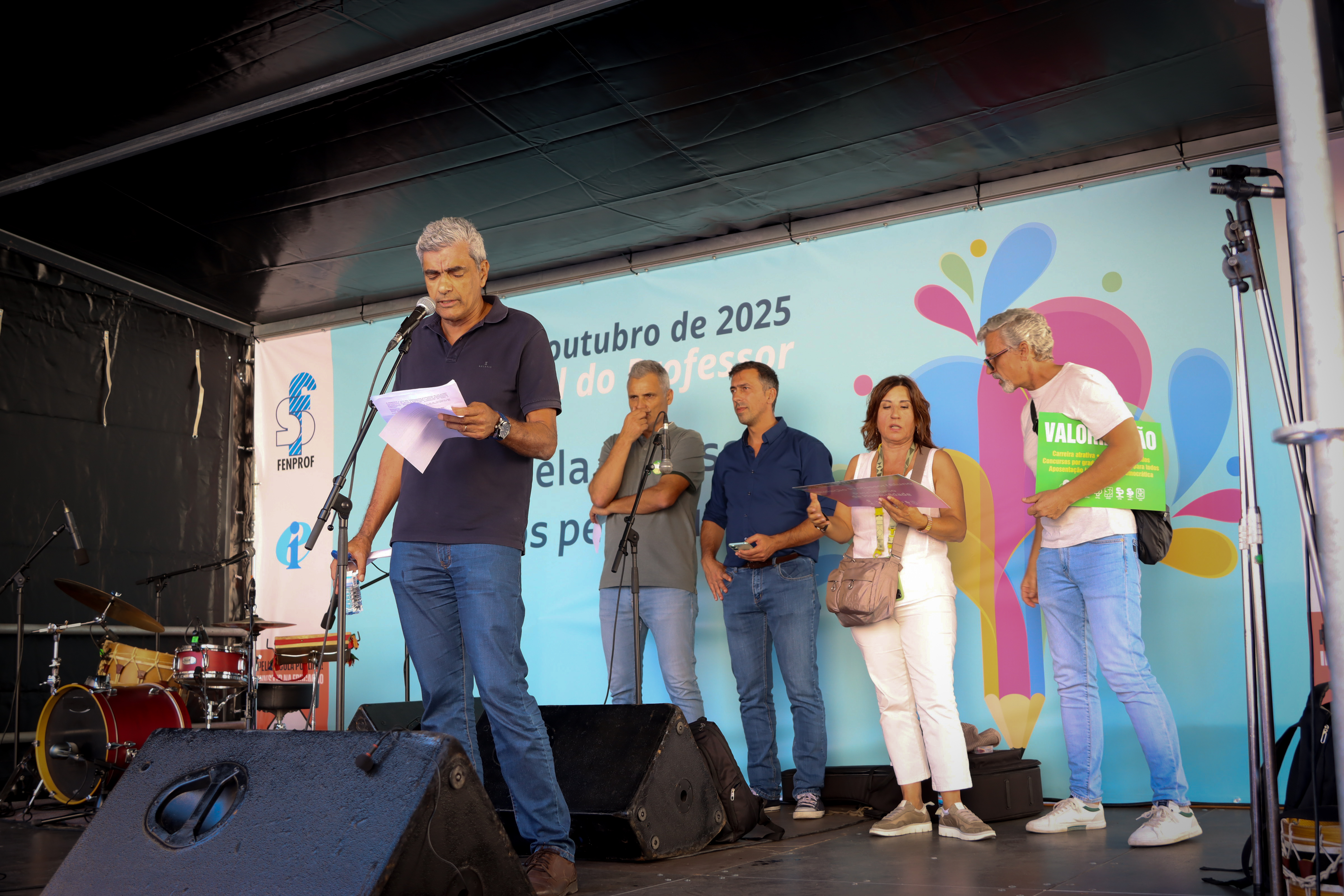 A FENPROF celebrou o 5 de outubro, Dia Mundial dos Professores, este sábado, dia 4 de outubro, com uma ação de luta em Lisboa, com concentração e desfile, desde o Jardim do Arco do Cego até ao edifício sede da Presidência do Conselho de Ministros, para lembrar ao governo os compromissos assumidos internacionalmente, reclamar de novo a valorização da profissão docente e reafirmar que a Educação não pode esperar!