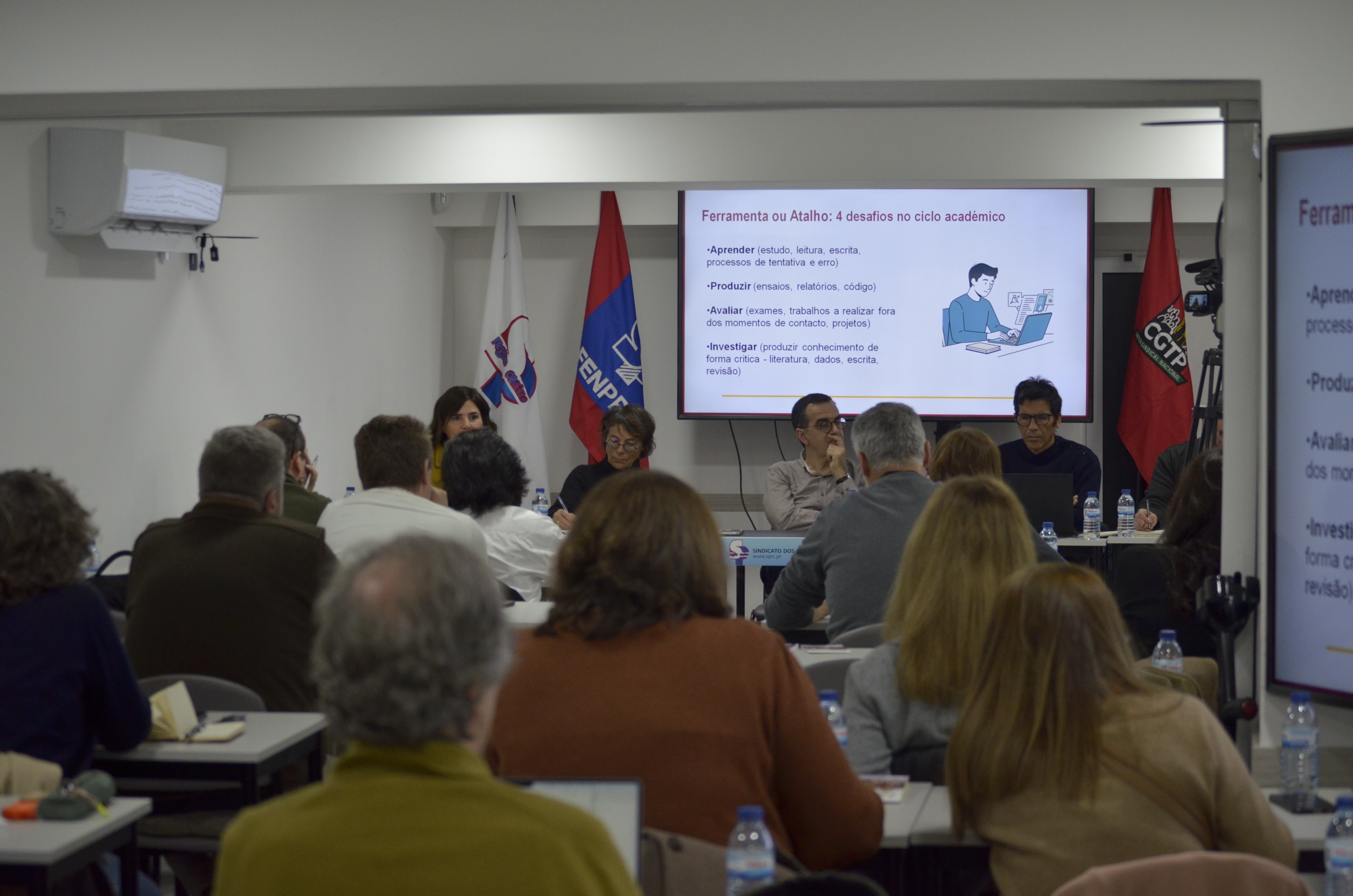 O debate que se seguiu destacou tanto as potencialidades da IA como os seus limites e riscos, sobretudo quando utilizada sem controlo democrático ou ao serviço de interesses alheios à formação pedagógica e à criação de conhecimento.