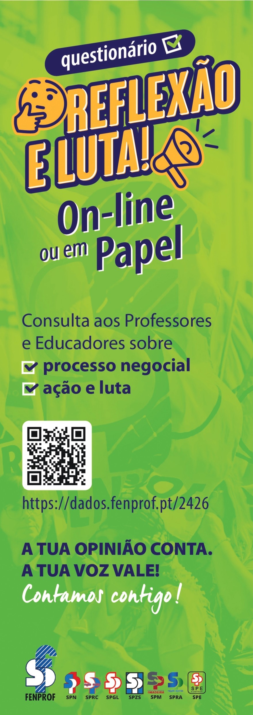 A Semana Nacional de Reflexão e Luta, que irá decorrer entre os dias 24 e 30 de abril, será mais um desses momentos. No decurso das reuniões e plenários sindicais que se irão realizar em todo o país, auscultando os docentes sobre formas de luta a desenvolver, aprovando tomadas de posição e reforçando o compromisso coletivo com a mobilização urgente e necessária para defender a profissão, irá ser distribuído um questionário, que poderá ser preenchido online ou em papel.