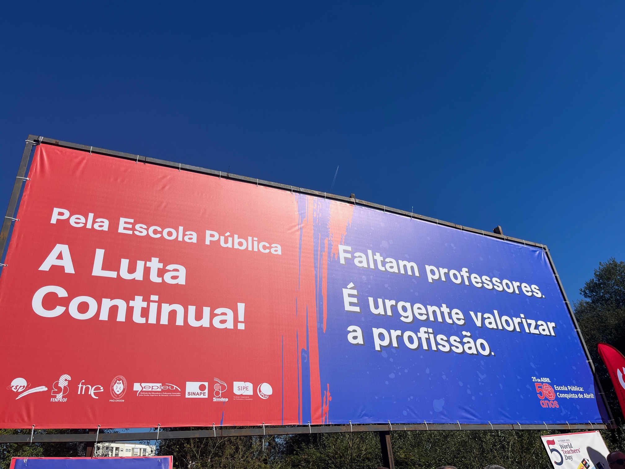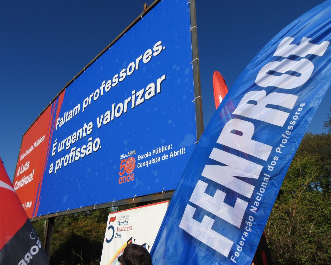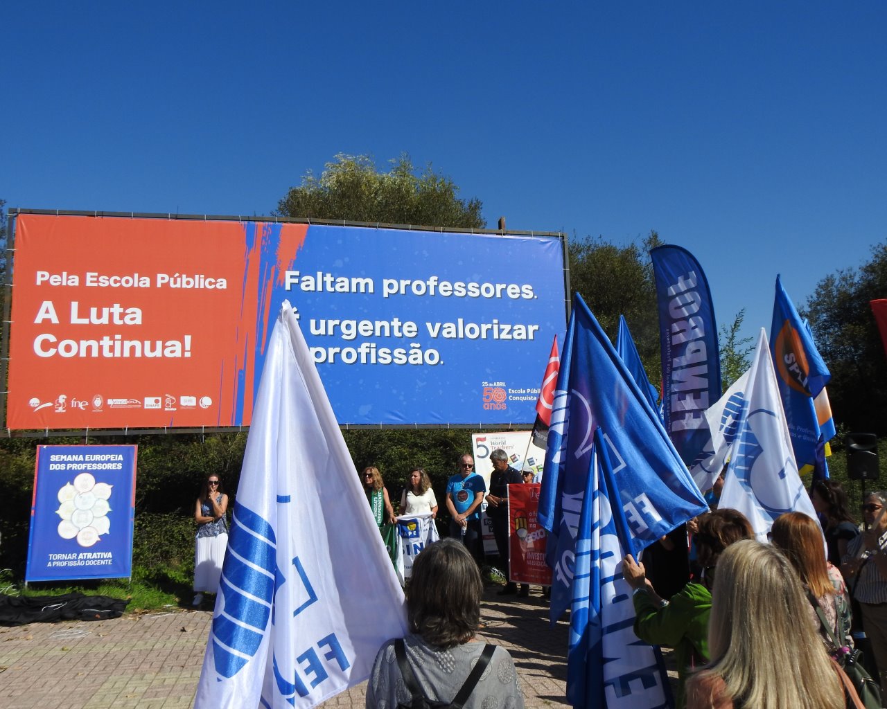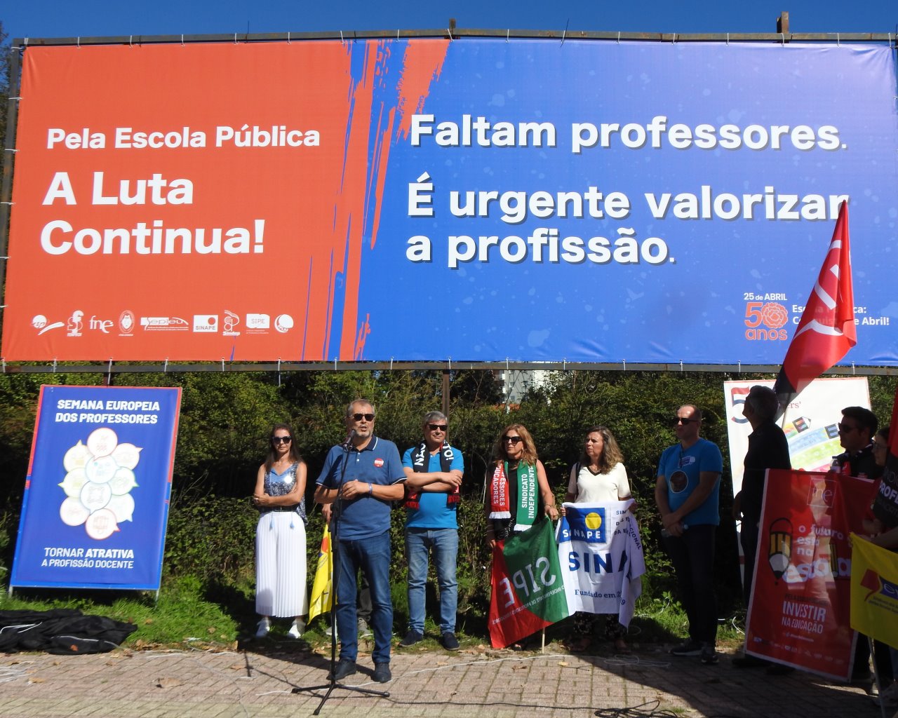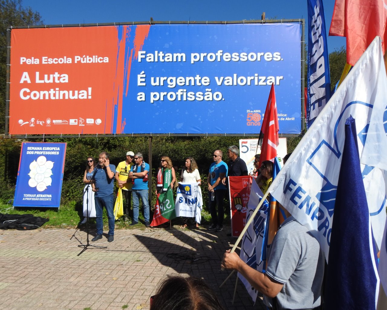 Na Semana Europeia dos Professores, ASPL, FENPROF, FNE, PRÓ-ORDEM, SEPLEU, SINAPE, SINDEP, SIPE e SPLIU inauguraram 12 painéis "Em Defesa da Escola Pública" que vão estar nas principais vias de circulação automóvel, de norte a sul, da A28, no Minho, até à EN 125 no Algarve, passando, entre outras, por A1, A8 ou A2, ao longo do 1.º período letivo.