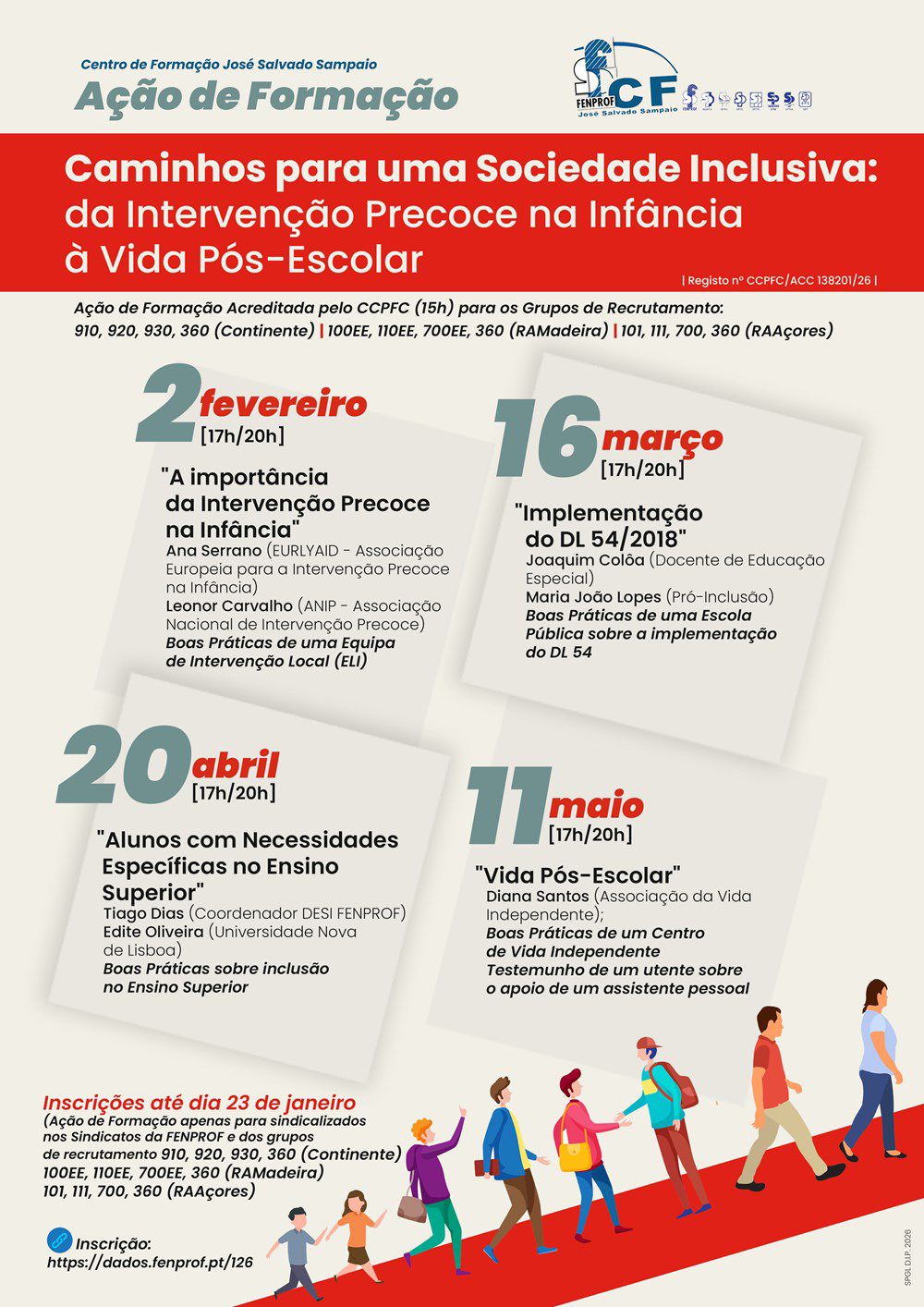 O curso de formação "Caminhos para uma sociedade inclusiva: da Intervenção Precoce na Infância à Vida Pós-Escolar" está acreditada pelo Conselho Científico-Pedagógico da Formação Contínua para os grupos de recrutamento 910, 920, 930, 360 (continente), 100EE, 110EE, 700 EE, 360 (região autónoma da Madeira), 101, 111, 700, 360 (região autónoma dos Açores).