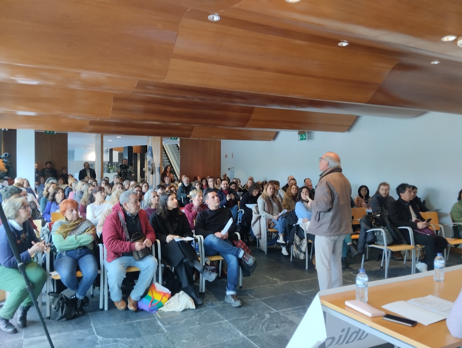 Em Castelo Branco, as condições atmosféricas obrigaram à recolha no Auditório da Biblioteca Municipal. Com a sala cheia falou-se neste dia de uma das matérias que os docentes têm destacado na sua luta: condições de trabalho na profissão, em particular os horários, os abusos, as ilegalidades, o sobretrabalho... Exigindo respostas que os professores querem levar na sua luta até ao voto!