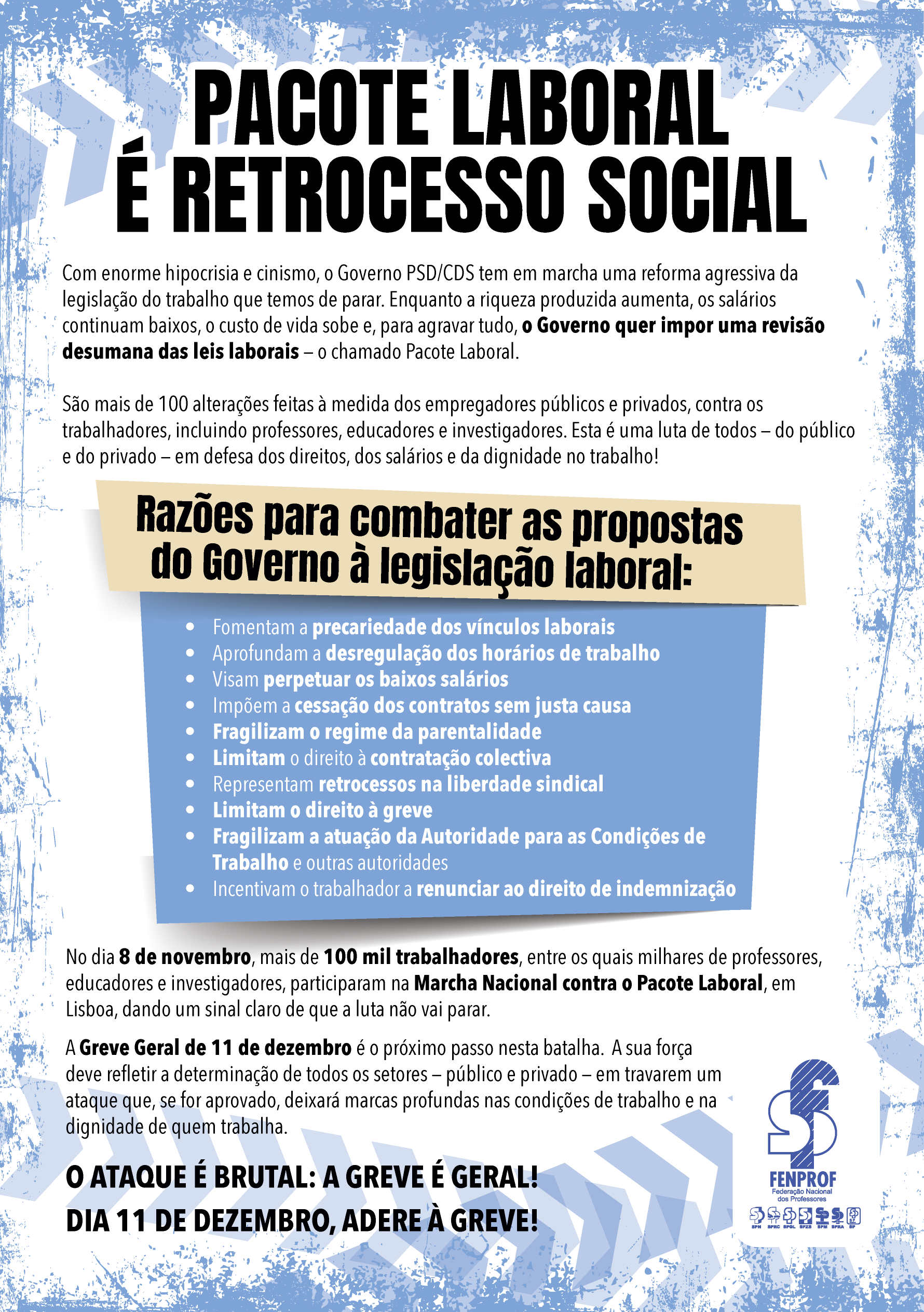 A luta contra o pacote laboral que o governo PSD/CDS quer impor é uma luta de todos os trabalhadores — e é também uma urgência para os professores, educadores e investigadores. Nenhum trabalhador do setor público ficará imune às consequências de um pacote que pretende restringir direitos, fragilizar a contratação coletiva, facilitar o despedimento e aumentar a precariedade.