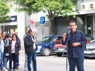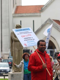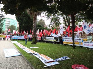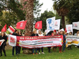 À porta do Ministério do Trabalho, Solidariedade e Segurança Social, várias dezenas de trabalhadores concentraram-se, em protesto, enquanto decorria mais uma reunião negocial com a CNIS e a UMP.
