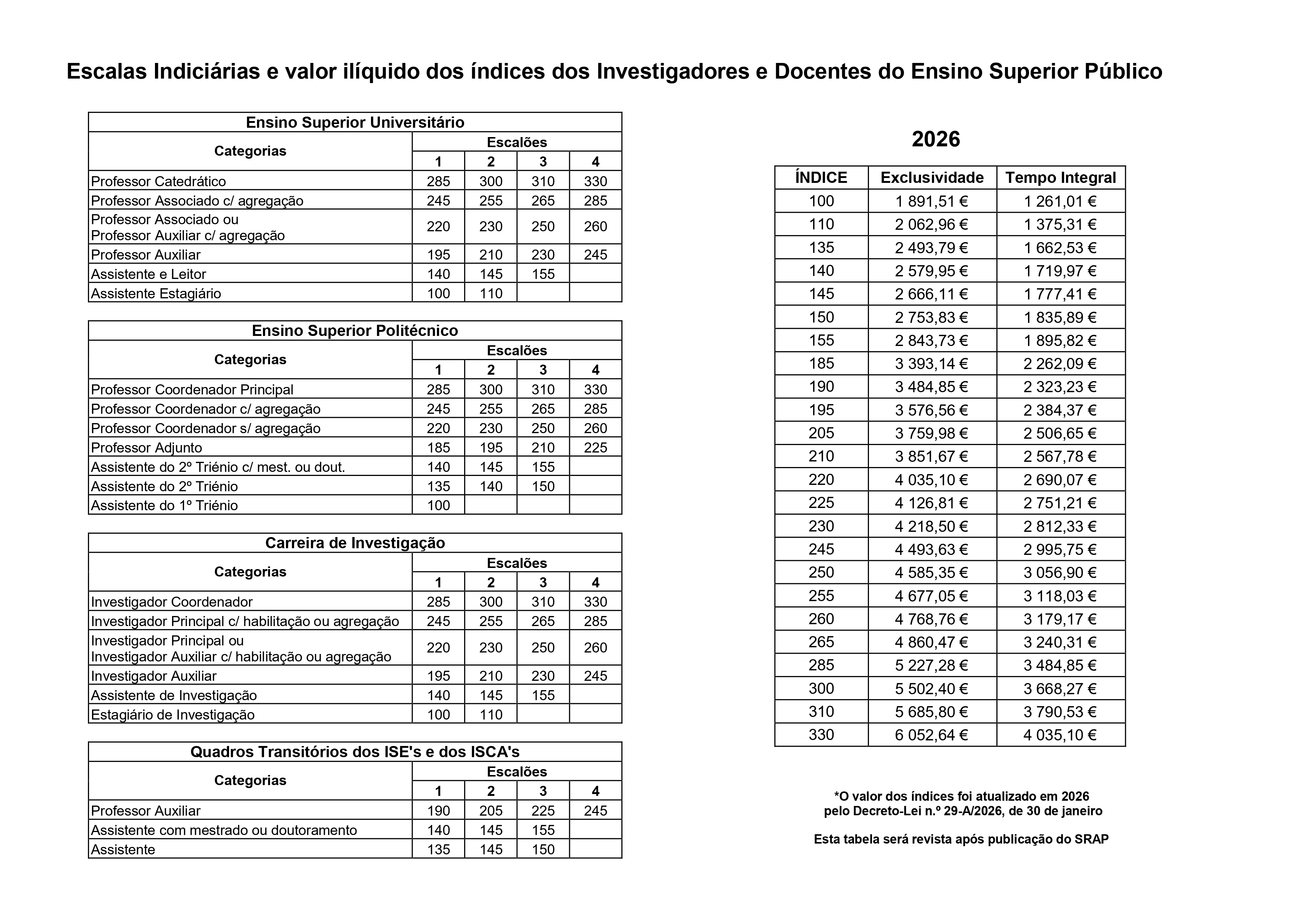 Vencimentos, escalões e índices do Ensino Superior e Investigação